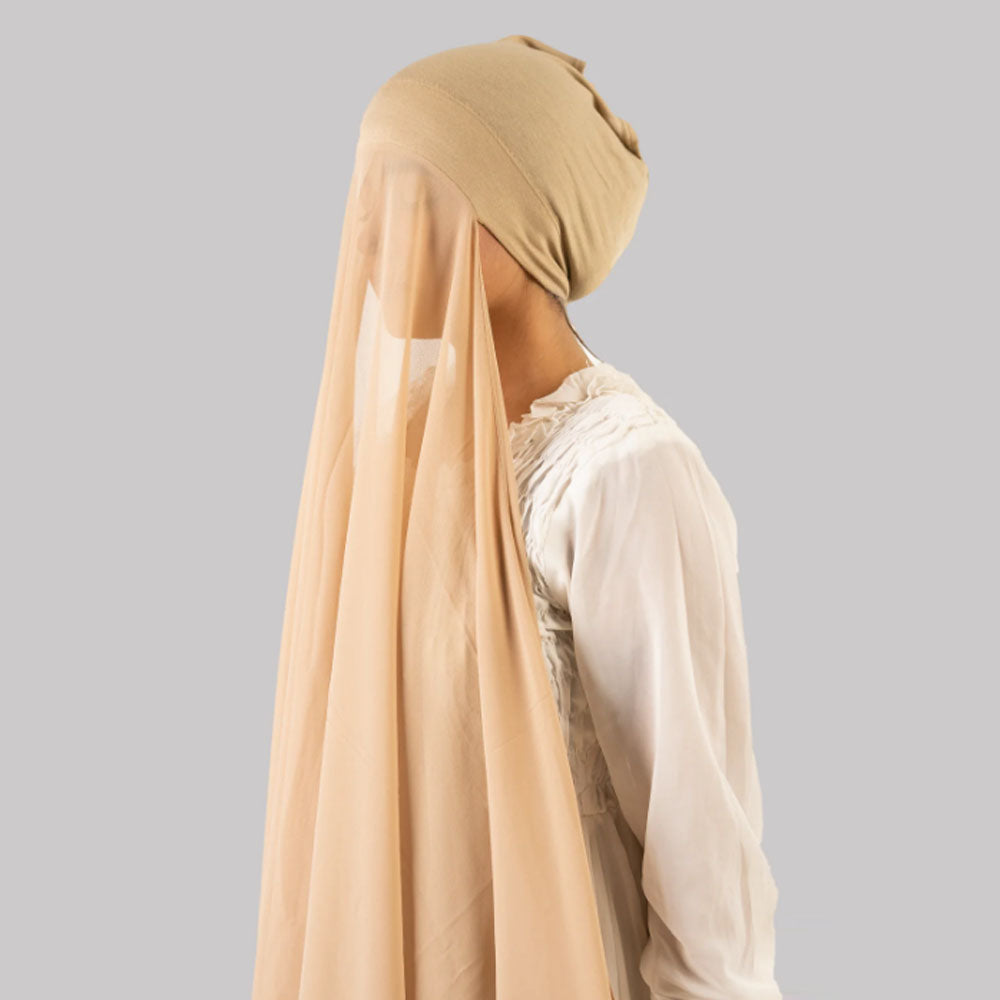 Beige hijab ab meri wardrobe ka essential part ban gaya hai. Cap attached hone se convenience level next level hai.